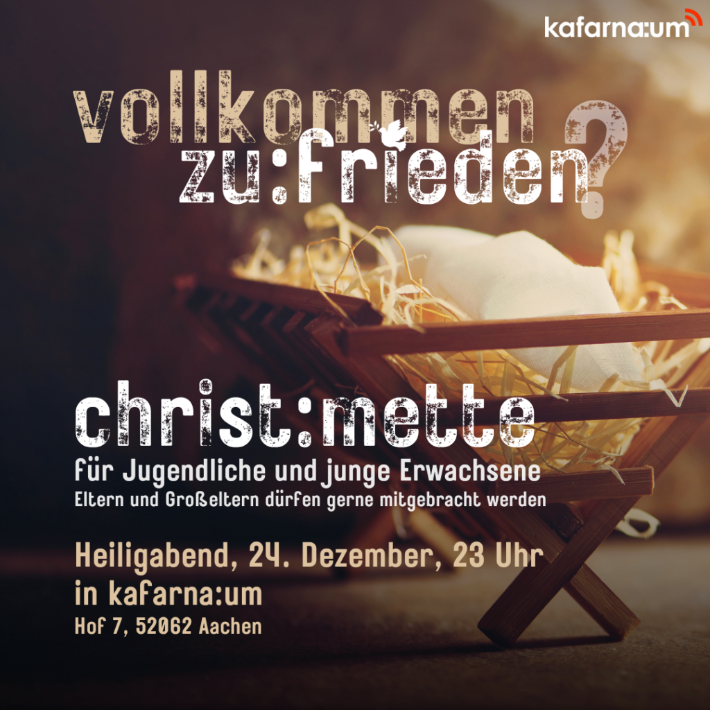 Ganz spät am Heiligabend um 23 Uhr treffen wir uns in kafarna:um wieder und feiern das Fest der Geburt Jesu. Dabei singen wir nicht nur Weihnachtslieder, ein paar Klassiker gehören aber natürlich dazu. Zu dieser Messe darfst du ausnahmsweise deine ganze Familie nach kafarna:um mitbringen: Geschwister, Eltern, Großeltern und wer sonst mit dir Weihnachten feiert.