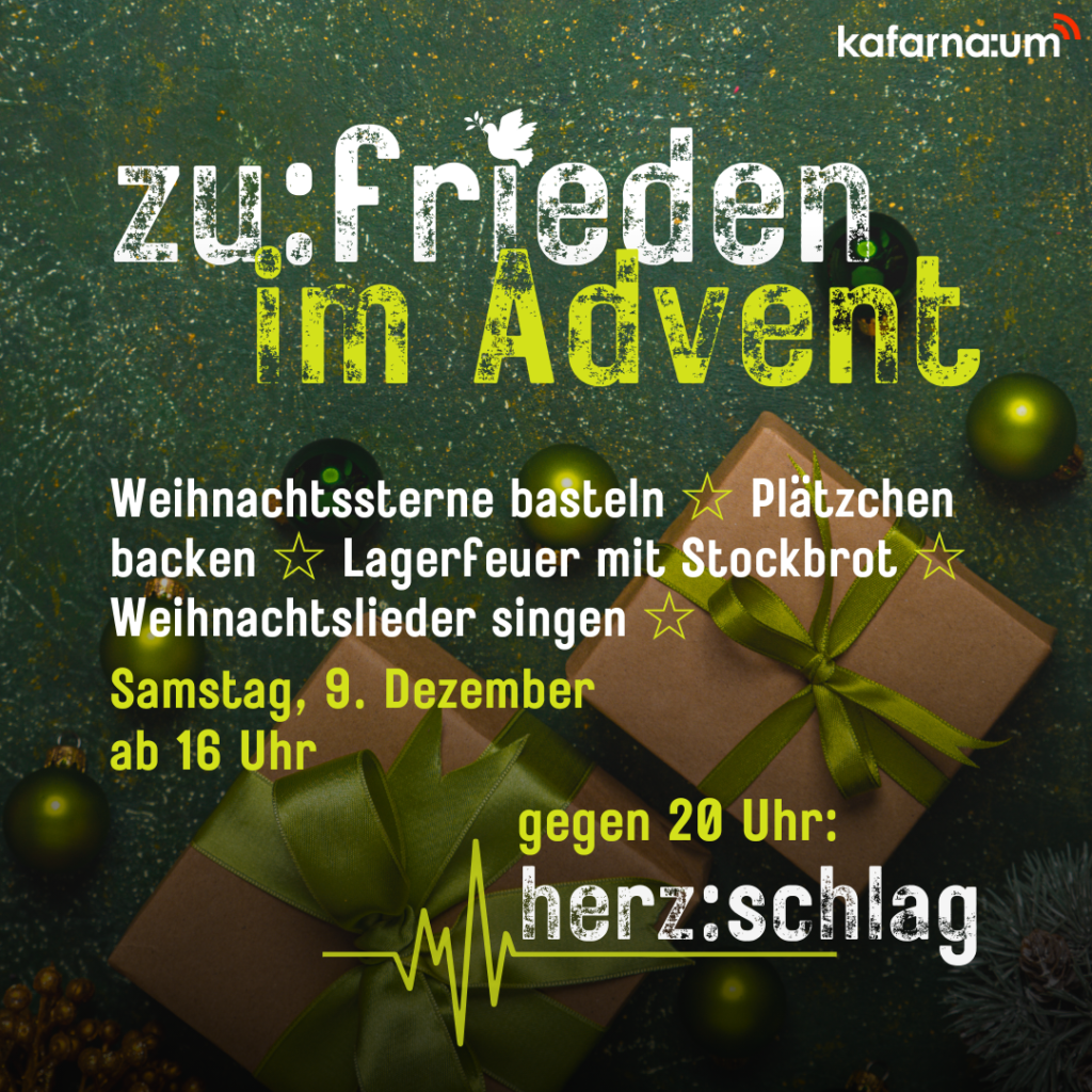 Die Adventszeit wird bunt in kafarna:um. Und wir gehen den Fragen nach: Was gehört eigentlich zu Frieden und Zufriedenheit dazu? Was macht mich wirklich zufrieden? Warum ist Frieden nicht selbstverständlich? Und was hat das alles mit Weihnachten zu tun?