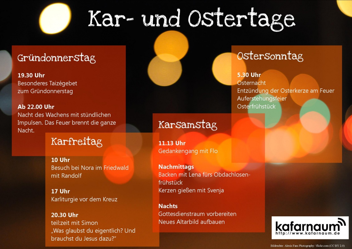 Von Gründonnerstag Abend bis zum Ostermorgen ist in kafarna:um fast durchgehend jemand da. Zum Reden und Lachen, Weinen und Klagen, Feuer entzünden und Musik machen und gemeinsam Schweigen. Vielleicht gibt es auch irgendetwas, worüber du in aller Ruhe reden möchtest und das zwischendurch keinen Platz hat. Wenn du irgendwann zwischen Donnerstagabend und Sonntagmorgen eine feste Zeit für ein vertrauliches Gespräch brauchst, sprich mich einfach an – direkt oder melde dich unter 0175-4801735. Ich nehme mir gern Zeit für dich.