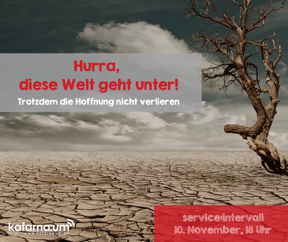 Die Welt geht unter. So schallt es aus fast allen Kanälen entgegen. Der Planet geht kaputt, Maschinen übernehmen die Herrschaft und ersetzen unsere Jobs, Beziehungen, die dir wichtig sind, zerbrechen und irgendwann zündet einer eine Bombe, die uns auslöscht. Wie kriegst du es eigentlich hin, bei all den Schreckensnachrichten nicht die Hoffnung und den Lebensmut zu verlieren? Was gibt dir Kraft, optimistisch in die Zukunft zu schauen? Dies und mehr im service:intervall am 10. November um 18 Uhr.