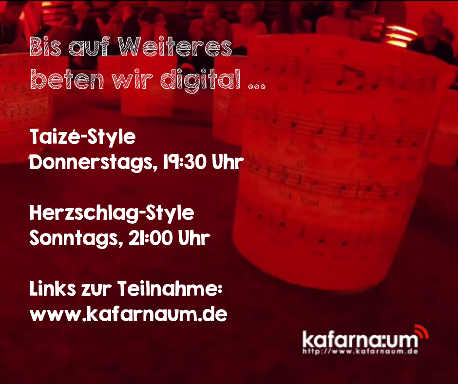 einige Menschen aus kafarna:um haben gerade jetzt das Bedürfnis, miteinander im Austausch zu bleiben, zu erzählen, zu beten, voneinander zu erfahren. Deswegen gibt es bis auf Weiteres zwei kleine digitale Gottesdienste pro Woche.