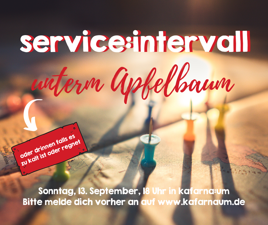 Es gibt diese besonderen Orte, mit denen wir wichtige Ereignisse verbinden. Das Gefühl von Freiheit, den ersten Kuss oder eine harte Niederlage. An manchen waren wir nur einmal, andere suchen wir immer wieder auf. Aber sie sind eingebrannt in unser Gedächtnis. Weil sie uns mit etwas verbinden, das größer ist als wir selbst. Über solche Orte sprechen wir am Sonntag im service:intervall. Los geht’s wie immer um 18 Uhr. Wir planen, erneut im Hof zu feiern. Sollte es regnen oder zu kalt sein, verlegen wir uns kurzfristig in den Saal über kafarna:um. Dort ist genug Platz. Wie immer gibt es Musik, Essen und Trinken, gute Geschichten und wunder:volle Menschen. Bitte melde dich an, wenn du dabei sein willst:
