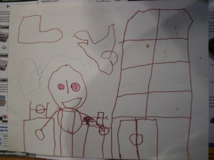 PPS: Titelbild: „Papa grillt ein Hähnchen. Er steht hinten bei der Kiefer, weil die Tür so klein ist“ (Florian Sobetzko 1977, Filzstift und Kugelschreiber auf Altpapier“