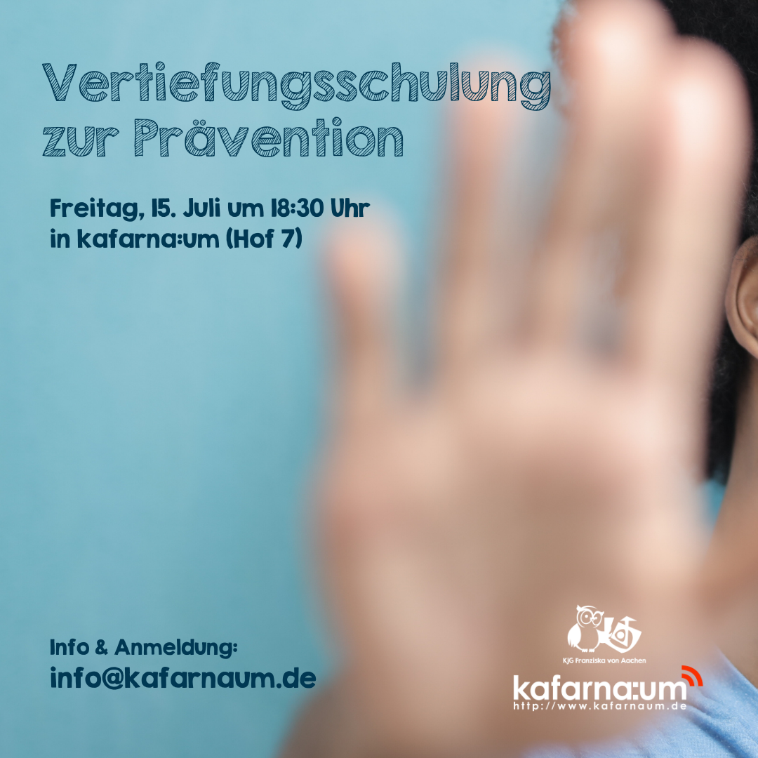 In allen kirchlichen Gemeinden, Gruppen und Verbänden sollen sich Menschen sicher fühlen und ihre persönlichen Grenzen sollen geschützt sein. Damit das geschieht, müssen alle, die sich in der Kinder- und Jugendarbeit engagieren, entsprechend geschult sein. In der Pfarre Franziska von Aachen, zu der auch kafarna:um gehört, kannst du jetzt eine entsprechende Vertiefungsschulung (3-stündig) machen, die man spätestens 5 Jahre nach der Basisschulung machen muss.