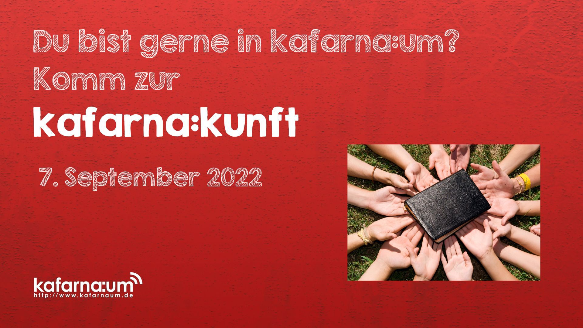 Deshalb wollen wir vom Gemeindeteam uns mit allen Schlüsselinhaber:innen und allen, die zu kafarna:um gerne etwas beitragen möchten, treffen und laden ein zur kafarna:kunft am Mittwoch, den 07. September von 18.00 bis 20.00 Uhr.