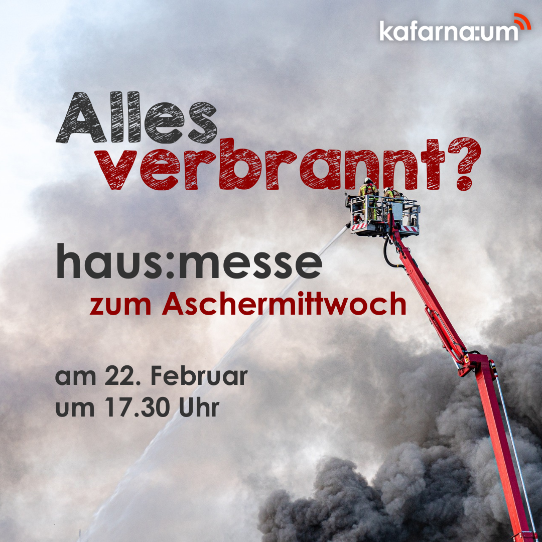 Endlich wieder haus:messe! Am Mittwoch, den 22.02. um 17.30 Uhr feiert kafarna:um zusammen mit Christian Dieckmann einen Gottesdienst zum Aschermittwoch. „Alles verbrannt?“ – was ist eigentlich gerade los auf der Welt, was gibt Hoffnung und was hat das mit Asche zu tun? Darüber wollen wir nachdenken und ins Gespräch kommen.