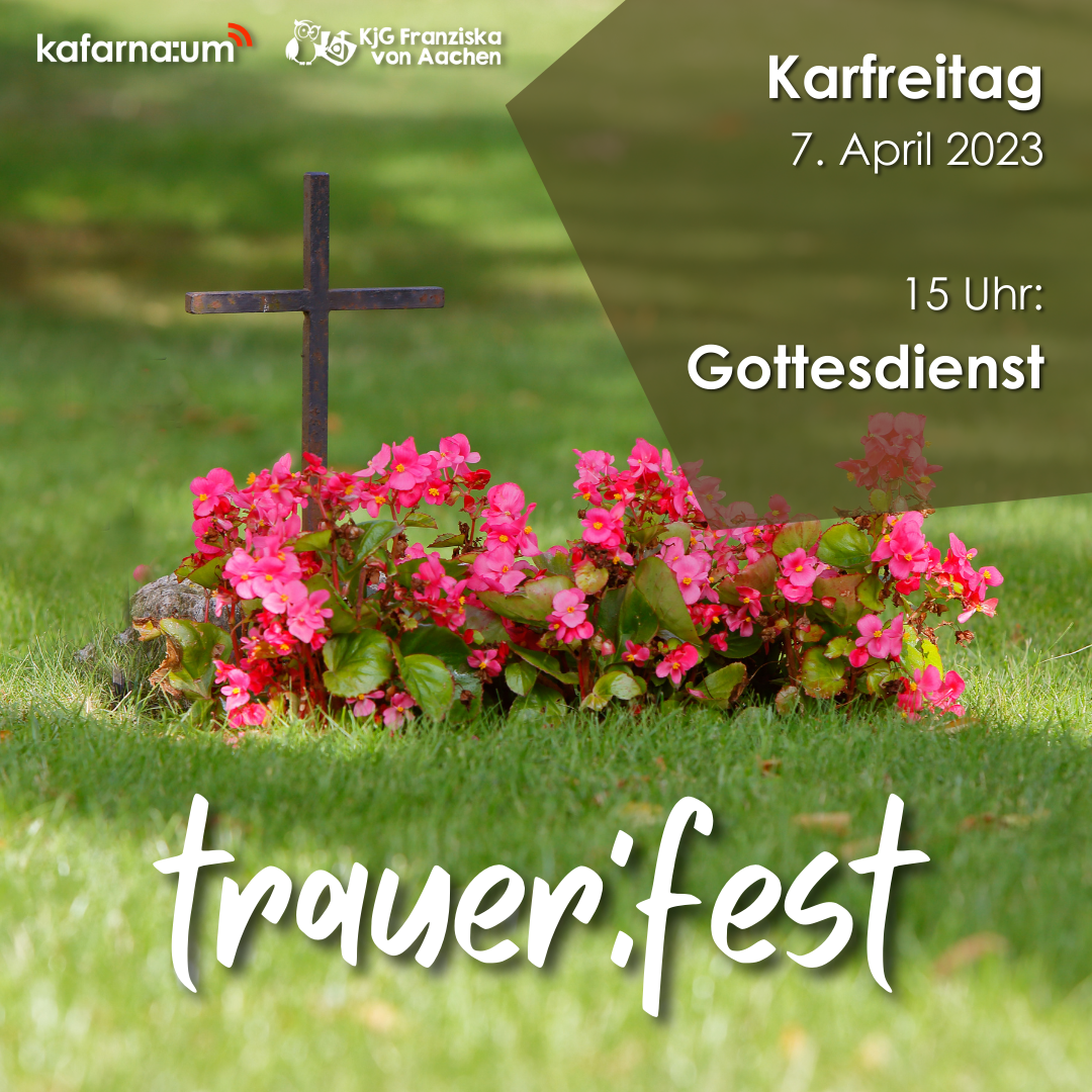 Wir feiern unser trauer:fest über das Leiden und Sterben von Jesus an Karfreitag, den 7. April um 15 Uhr in kafarna:um und möchten versuchen, uns mit einigen kafarna:typischen Elementen, einen neuen Zugang dazu zu schaffen.