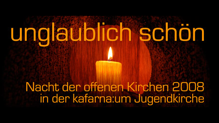 Am Freitag, 17.10.2008, 20:00-00.30 Uhr findet in Aachen wieder die Nacht der offenen Kirchen statt. Für Kafarna:um ein besonderes Datum, denn genau vor einem Jahr eröffneten wir zur NdoK, und in diesem Jahr präsentiert sich die neue Kafarna:um Hauskirche für Jugendliche und junge Erwachsene der Öffentlichkeit. Teils noch Baustelle, teils fertig zeigt sich die Jugendkirche der anderen Art mit neuen Seiten. Einfach kommen und reinsetzen.