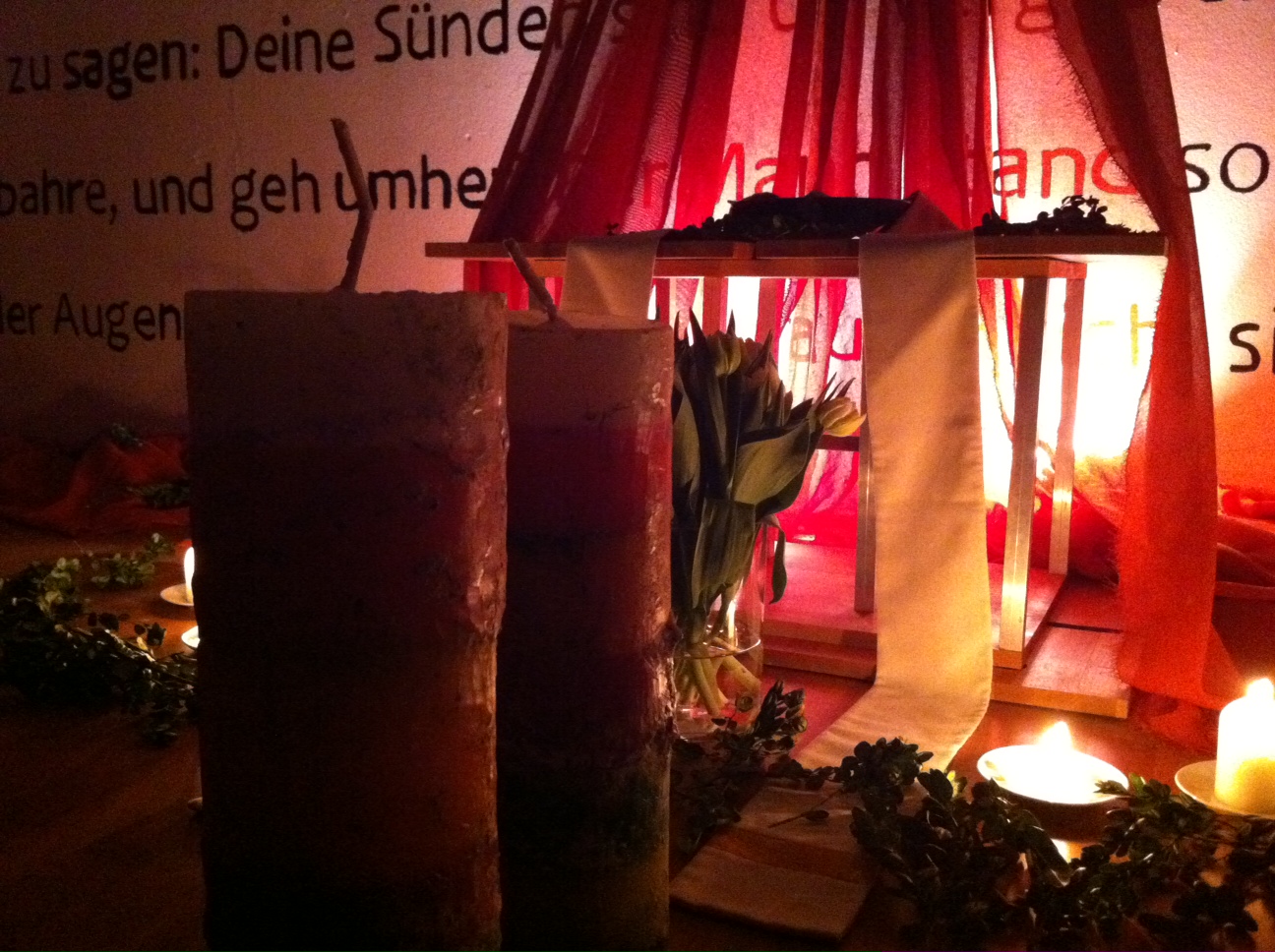 Wundervolle Psalmen mit Cello (Veronika) und Solostimmen (Svenja, Karola), Lumen Christi (Heiner), Osterlob (Florian) und Tauferneuerung (alle)…und später das Osterfrühstück (WalterW) mit selbstgebackenem Poschweck (Demiane) und bunten Eiern… Freu Dich!