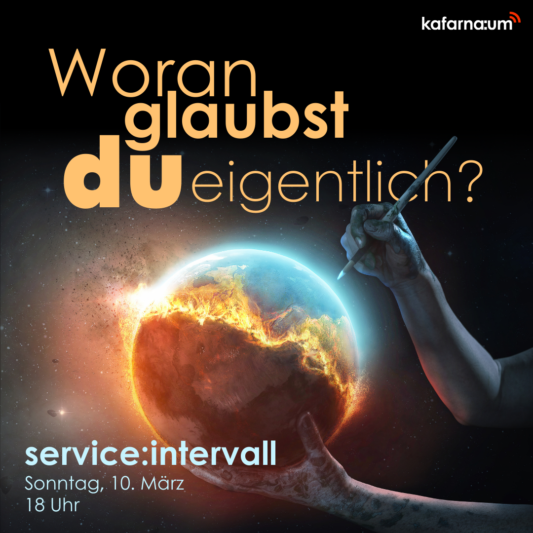 Ist Gott der alte Mann mit dem weißen Bart auf der Wolke oder die alles durchdringende ungreifbare Kraft oder ganz anders? Woran glaubst du eigentlich? Diesen und ähnlichen Fragen wollen wir beim nächsten service:intervall nachgehen und laden dich herzlich ein – wie immer am Sonntag um 18 Uhr mit leckerem Essen, guter Musik und netten Leuten.