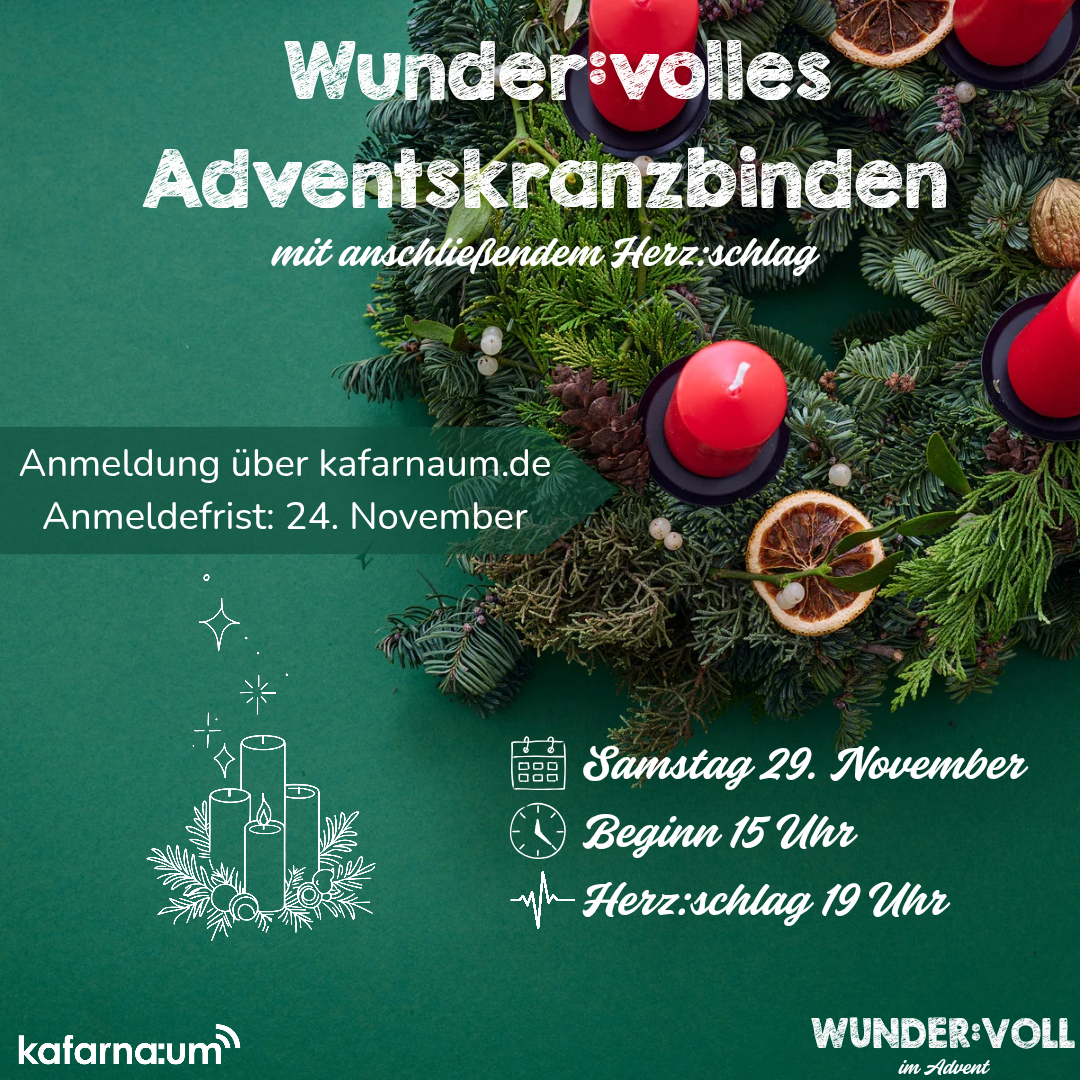 Komm vorbei und gestalte deinen individuellen Kranz. Wir stellen das Grün, die Rohlinge und den Draht – du bringst deine Kerzen und Kerzenständer nach Wahl mit und alles andere an Deko, was auf deinen Adventskranz gehört. Gib uns bis zum Montag den 24. November Bescheid, ob Du dabei bist, damit wir entsprechend planen und Material einkaufen können.