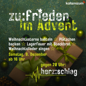Hin und wieder gibt es in kafarna:um ein Highlight für Dich. Beim service:intervall, unserem Jugendgottesdienst, kannst du ankommen, Pause machen und nette Menschen treffen. Bei Kerzenschein und schöner Atmosphäre gibt es Ideen und Inspiration für dein Leben, die Geschichten der Anderen und das Herzstück des service:intervalls: Ein gemeinsames Essen mit richtig guter Musik, deinen Themen […]