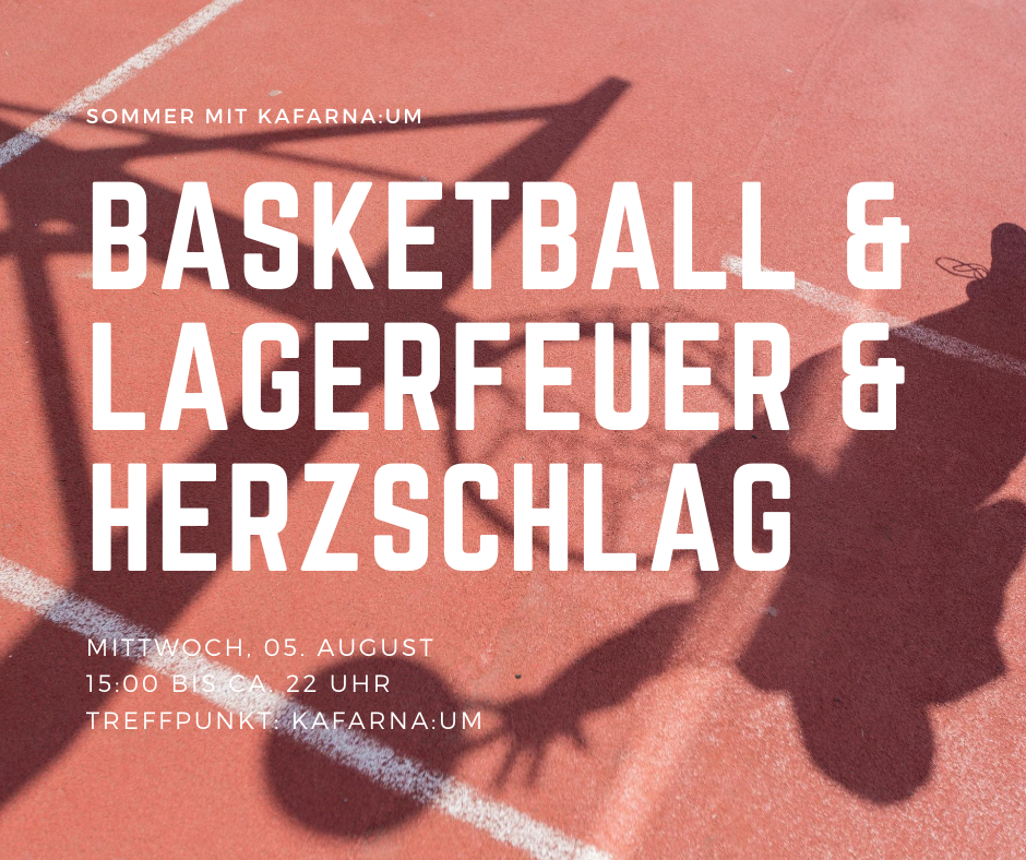 Wir wollen Basketball spielen gehen! Alles ganz entspannt, du kannst auch sehr gerne als Anfänger*in dabei sein (das sind mindestens 1/3 der Teamer auch). Wo genau steht noch nicht ganz fest, wir treffen uns auf jeden Fall erstmal in kafarna:um. Danach kommen wir in Ruhe wieder zurück, essen gemeinsam, machen Lagerfeuer und beenden den Tag mit einem Herzschlag.