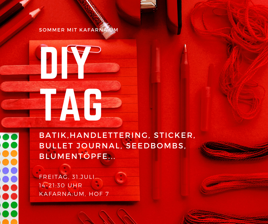 Endlich kommt er: Der Tag, an dem du deine gesammelte Kreativität ausleben kannst. Von Batiken, über Töpfe bemalen, Seed-Bombs herstellen, Handlettering auf Stickern oder in Bullet Journals. Dabei kannst du dich frei entscheiden, was und wie lange du etwas machen willst. Du kannst alle Aktionen machen, die du machen willst. Wir besorgen für alle Aktionen einen Grundstock, aber wenn du noch langweilige graue Töpfe, oder weiße Kleidung/Stoff oder ähnliches hast, dann bring das gerne mit. Eine weise Frau hat mal gesagt: „Man kann alles batiken!“ Wir treffen uns mittags und verbringen den Tag kreativ miteinander. Abends holen wir zusammen Essen und lassen dann den Tag mit einem lustigen Karaokeabend ausklingen.