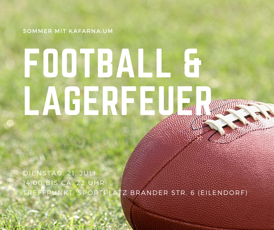Wenn du schon mal American Football gesehen hast und dir gedacht hast: Da tut man sich bestimmt weh! – dann haben wir eine gute Nachricht: Wir treffen uns zum Flag Football spielen. Das ist kontaktlos, Helme und Schutzausrüstung sind nicht nötig – und es macht mega viel Spaß! Du brauchst keinerlei Vorkenntnisse, um mitzuspielen. Wir erklären am Anfang auch alles nochmal für Anfänger*innen. Danach grillen wir in kafarna:um und machen ein schönes Lagerfeuer.